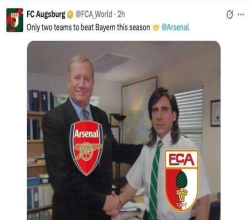 德甲第19轮,奥格斯堡客场2-1战胜拜仁慕尼黑。赛后奥格斯堡官方社媒晒和阿森纳握手梗图,并表示:“本赛季只有两...